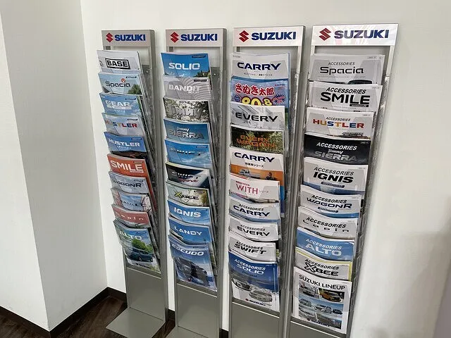 店頭には販売しているスズキ全車両のカタログがございます。乗りたいお車が決まっていなくても、ぜひ冊子を手に取ってご覧ください。その他メーカーのカタログも揃えております。国産車全車両はない為、事前に問い合わせ頂ければ取り寄せできます。お気軽にスタッフまでお申し付けください。